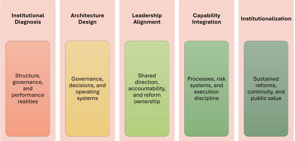 Our work includes leadership alignment, capability integration, and institutionalization to ensure reforms function in practice.